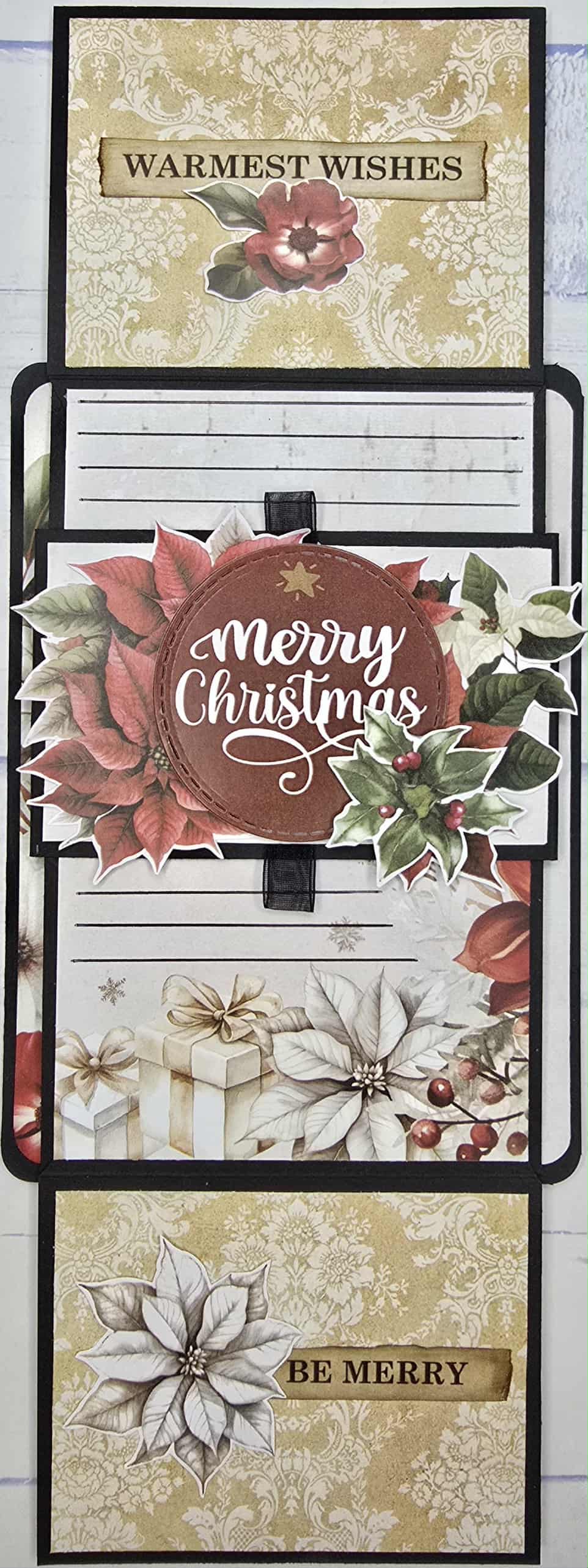 This unique card has a beautiful belly band that slides up and down the length of the card releasing the top and bottom flaps to reveal the message inside. When it sits in the centre it keeps both closed.