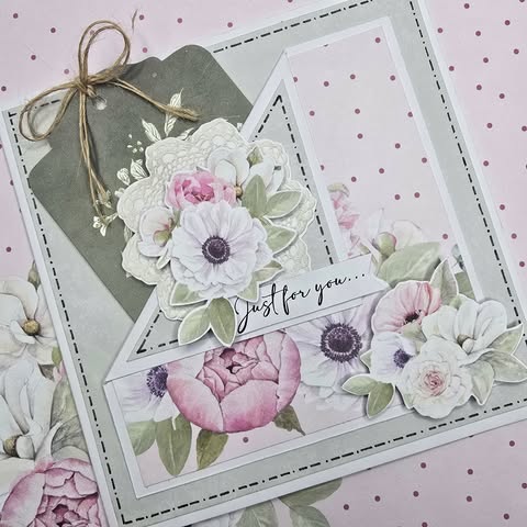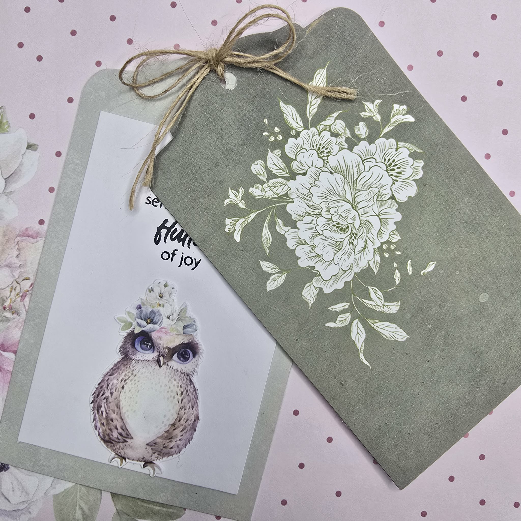 The stitched-look base frames a floral envelope pocket holding a large sage tag, tied with rustic twine and finished with a delicate white botanical print. Layered watercolour blooms, lace-style die-cuts and a handwritten sentiment create dimension and gentle romance. A sweet owl tag adds a whimsical touch, while pink polka dot accents keep the palette light and feminine.