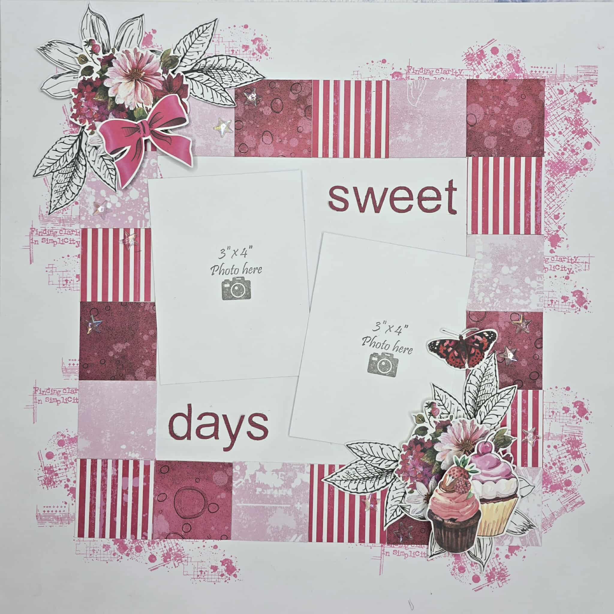 This playful layout features a bold pink grid of patterned squares and stripes, accented with splattered backgrounds and subtle stamped details. Embellished clusters of flowers, leaves, bows, cupcakes, and a butterfly frame the two photo spaces. The title “sweet days” adds a cheerful, celebratory finishing touch.