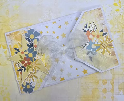 This handmade money-gift envelope features layered floral die-cuts on soft yellow patterned panels, using the new Uniquely Creative Written In The Stars collection, framed by crisp white mats and scattered stars. A translucent organza ribbon wraps the folded design, forming a delicate bow at the centre. Inside, a coordinated belly band secures the cash, finished with a floral cluster and a lovely themed sentiment.